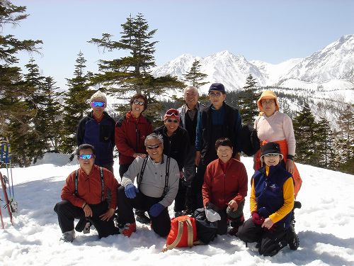 彼らはあの遥かな山頂からどちら方向に滑り降りてくるのでしょうか・・・。鹿島槍の双耳峰は南の空から吹いてくる風による黄砂にかすんでいますが、五竜から北は青空の下、澄み切った空が